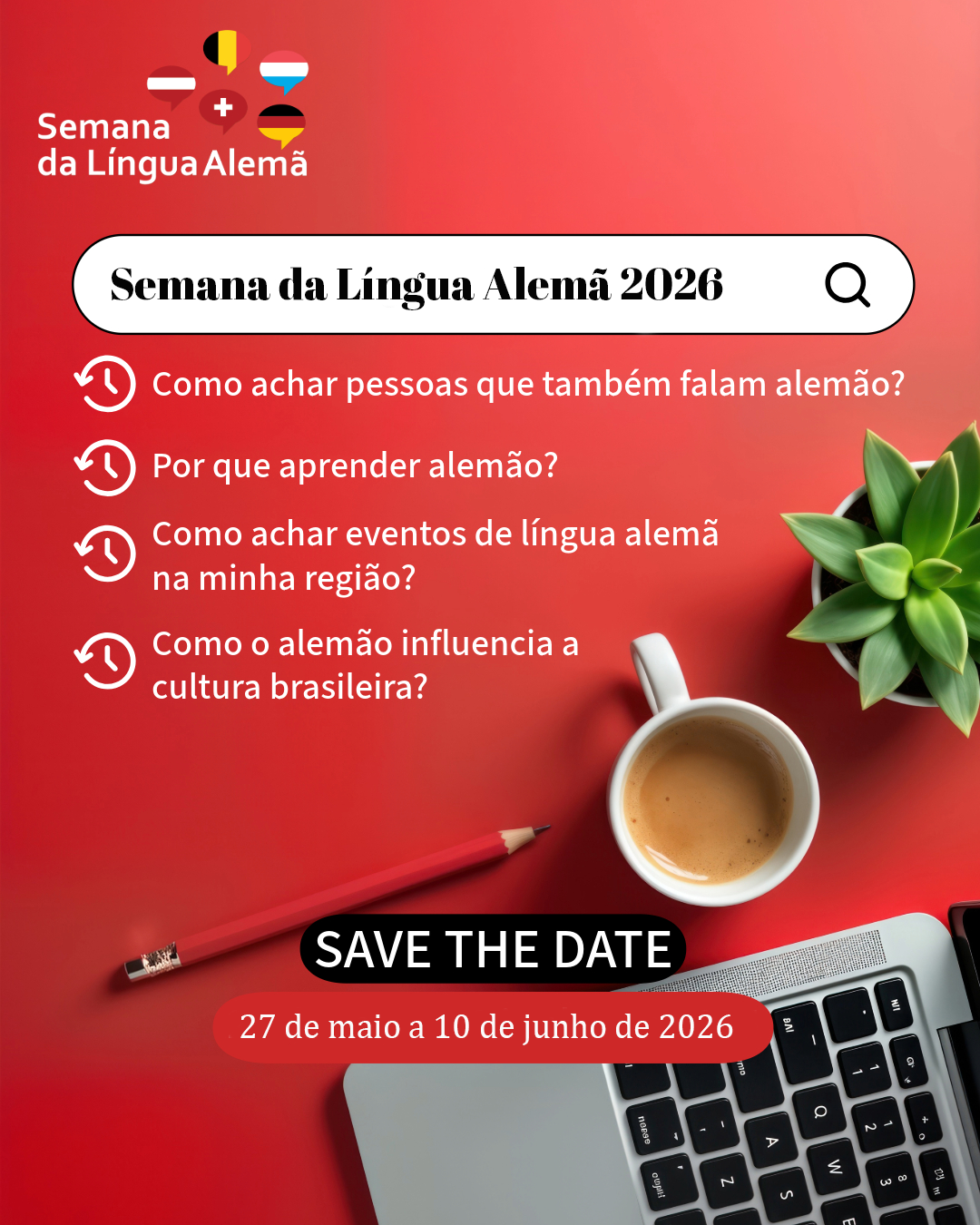Buscar Eventos... Buscar Eventos... Semana da Língua Alemã 2025 A Semana da Língua Alemã, criada em 2016 pelas Embaixadas da Alemanha, Áustria, Bélgica, Luxemburgo e Suíça, será realizada este ano já pela 9ª vez, de 24 de maio a 8 de junho de 2025. Saiba mais